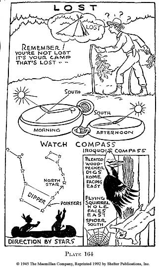 Iroquois Compass: The white man has always marveled at the ability of the Indian in finding his way in the wilderness without a compass. Many of our early frontiersmen soon learned from the red men how to tell direction even when the sun or stars were obscured. The Iroquois knew a number of signs which pointed direction (Plate 164).