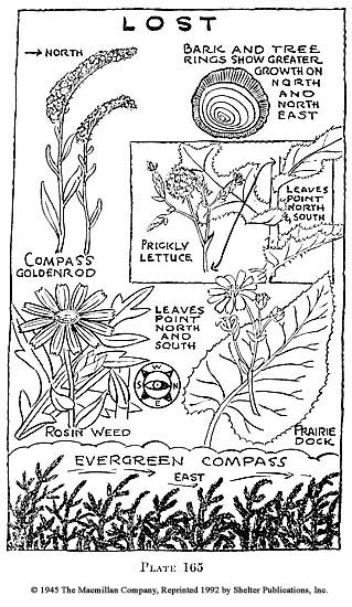 Evergreen Compass: The feathery tips of pines and hemlocks usually point in an easterly direction (Plate 165). Collectors of spruce gum in the North Woods say that the gum oozing from the south side of a tree is a clear amber color while that of the north side is a dirty gray color.