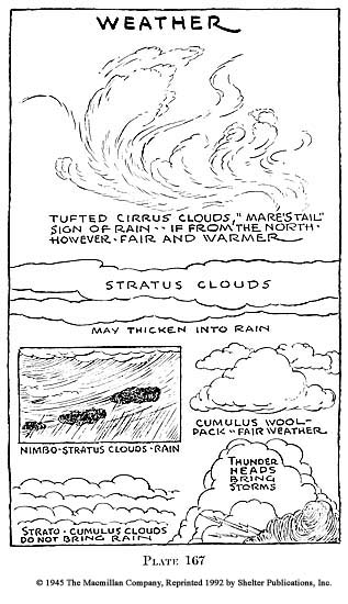 When the cirrus clouds, the wispy curls high in the air, move swiftly, watch out for rain (Plate 168). A variation of the cirrus clouds is the so-called mackerel sky. This also tells of storms to come. Clouds moving in different directions at various levels foretell rain. Smoke rising and then falling again, indicates rain. Here are a few weather proverbs worth remembering: