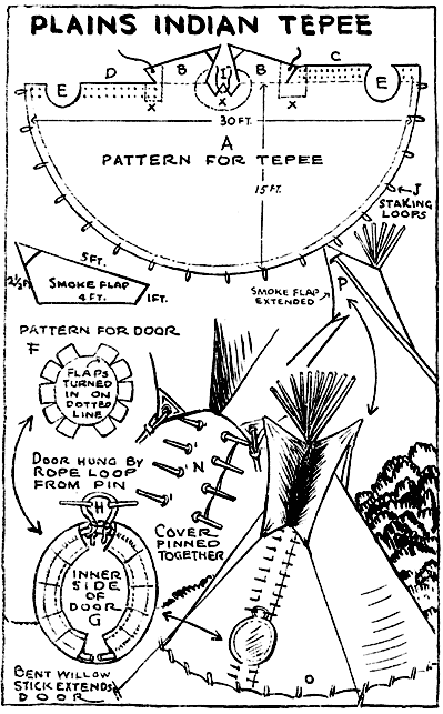 The tepee of the Plains Indians is a fine dwelling, where poles are available and a permanent camp is in order. It is a roomy structure in which a fire may be built, and is comfortable in extremes of heat or cold. The pattern of the tepee (Plate 67) is cut in the shape of a halfcircle (A), twice as long as it is wide, with 2 smoke flaps (B) near the center of the pattern. Fifteen by 30 feet is a good size. If the tepee is smaller, it is difficult to keep it free of smoke. Eight-ounce canvas is satisfactory for the cover.
