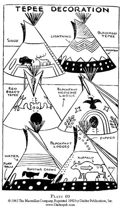 When decorating a tepee, spread it out flat, sketch in your design, and wet the canvas. This is to prevent the canvas from absorbing too much paint. Ordinary house or oil paints may be used.